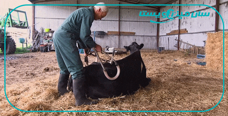 حمایت از پاها: هنگامی که گاو بلند میشود، باید پاهای عقب آن با نوارهای مخصوص بسته شود تا از حرکت خطرناک پاها جلوگیری شده و گاو بتواند وزن خود را به طور متعادل توزیع کند.